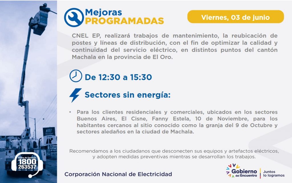 Machala – El Oro.- Mañana viernes 3 de junio, se realizarán trabajos de mantenimiento en algunos sectores de la ciudad de Machala y varios puntos del archipiélago Jambelí en el cantón Santa Rosa, provincia de El Oro.